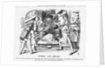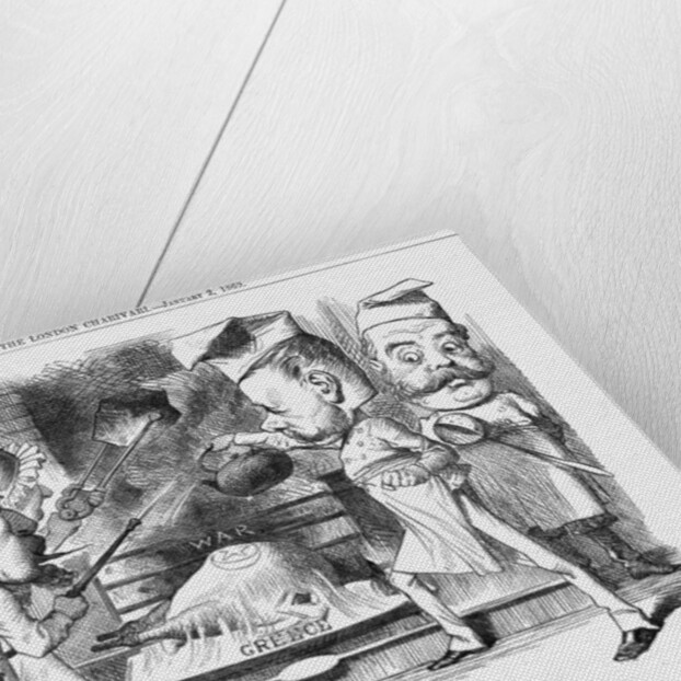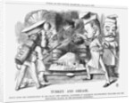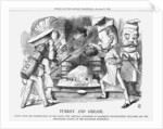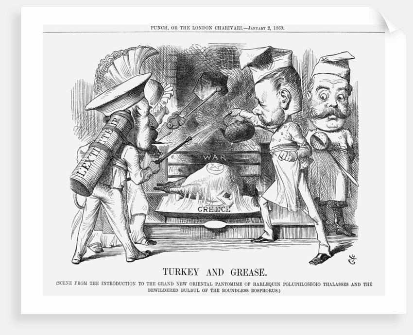 'Turkey and Grease', 1869. At the end of December 1868, there was a divergence of opinion between Greece and Turkey that threatened to lead to armed conflict. A hastily arranged conference of leading nations was to take place in Paris in the New Year. In this cartoon, then, Greece is the Turkey on the spit and Napoleon and Britannia are amongst those nations endeavouring to extinguish the fire. From Punch, or the London Charivari, January 2, 1869.