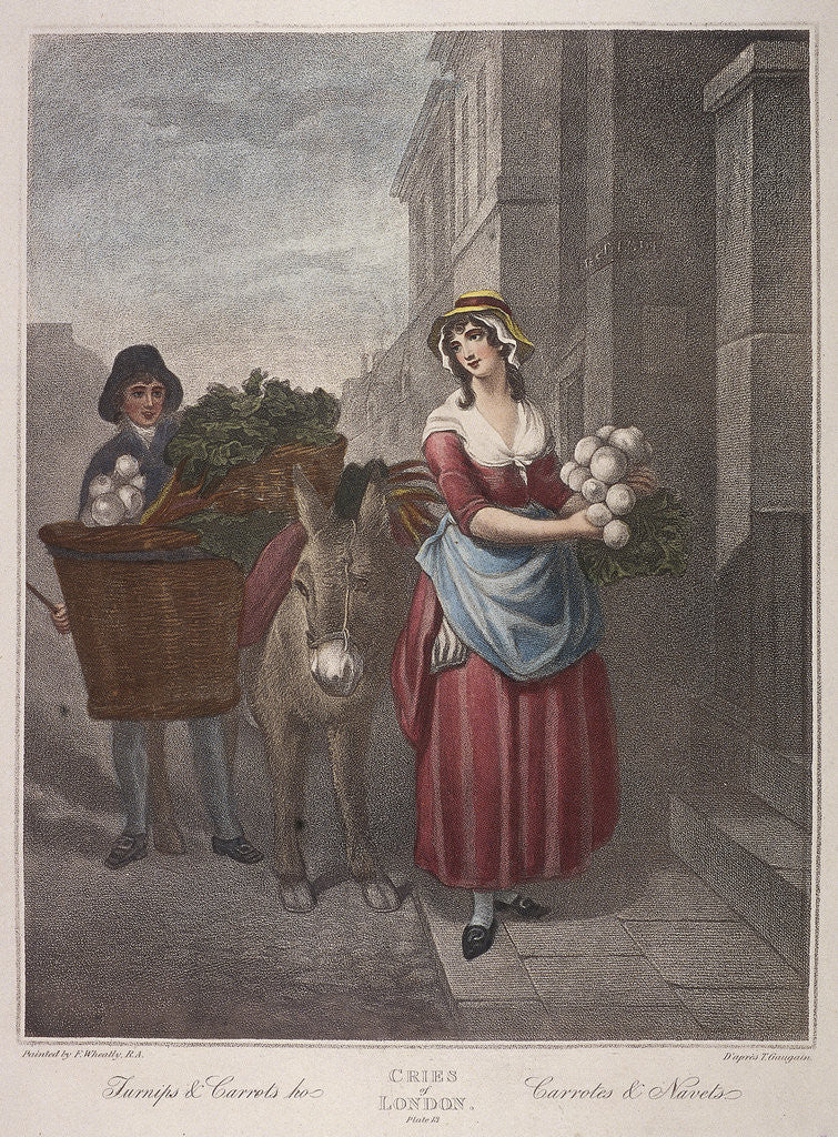 'Turnips & Carrots ho'. A turnip and carrot seller and his donkey laden with baskets. Standing next to them is a woman holding a bunch of turnips. From Cries of London, c1870.