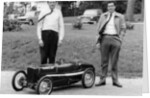 Product images of Two men standing by a miniature Sunbeam pedal car, 1960s