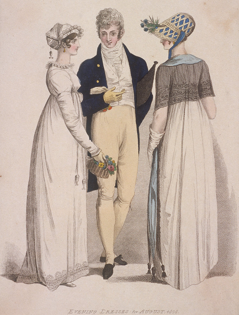 Two women and a man wearing evening dress, 1808. Both of the woman are wearing high waisted empire line dresses, while the man wears a frock coat and cravat.