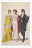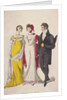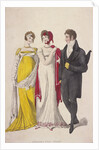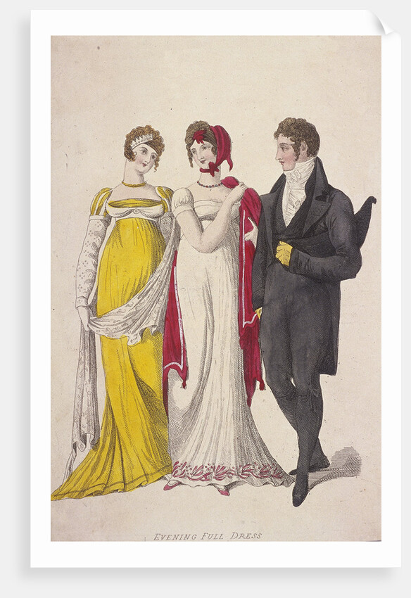 Two women and a man wearing full evening dress. c1810. The woman on the left is wearing a yellow empire line dress, while the woman next to her is wearing a plain white empire line dress with a red pattern round the hem, and a red shawl to match. The man is wearing a formal dress suit.