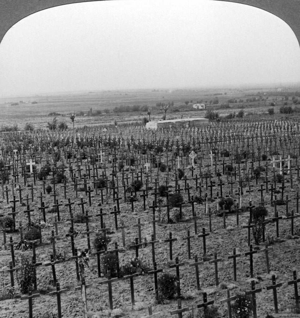 Tyne Cot Cemetery, Passchendaele Ridge, Belgium, World War I, c1918-1919. The cemetery stands on the spot Where 20,000 British soldiers fell attacking German positions during the Battle of Passchendaele (Third Battle of Ypres) in 1917. The cemetery gets its name from the description by the Northumberland Fusiliers of the German pillboxes as being similar in shape to tyne cots, Tyneside workers' cottages. It is the biggest Commonwealth war cemetery in the world, with 11,954 graves. Stereoscopic card detail.