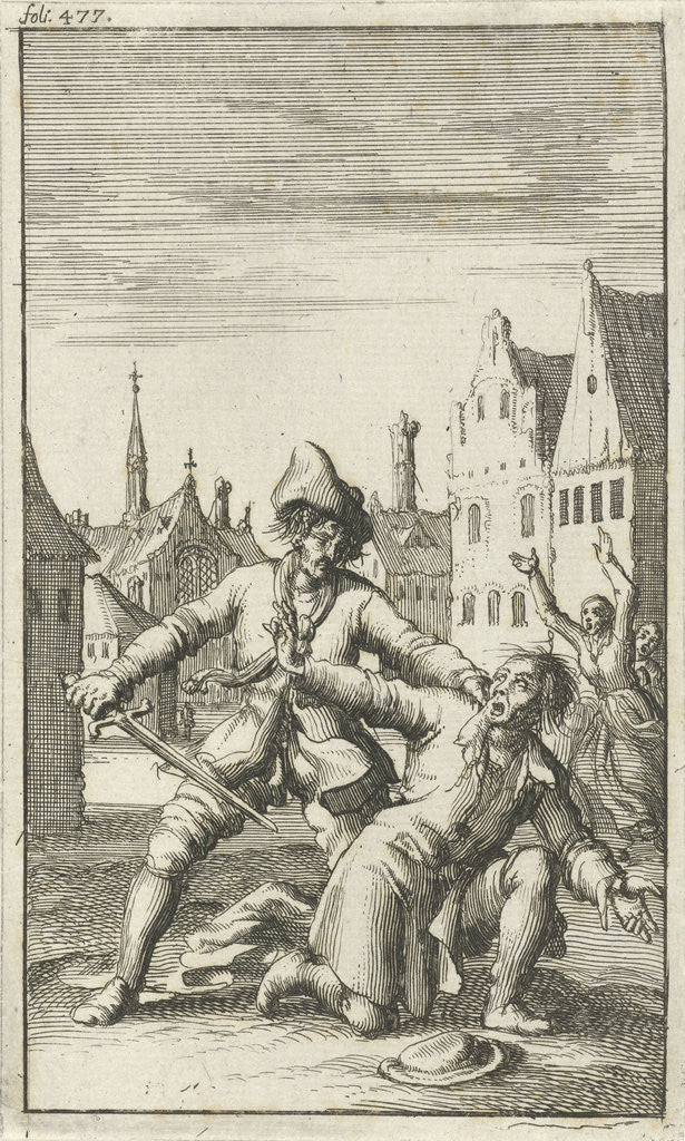 Unarmed man is threatened in the street by a man with a sword, Jan Luyken, Jan Bouman, 1685