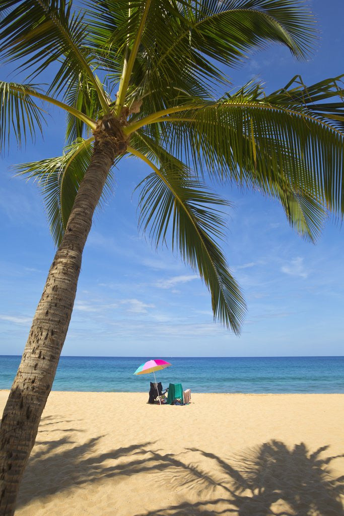 Product details Vacationing couple's beach chair and umbrella on Hulupo'e Beach; Manele Bay; Lanai; Hawaii