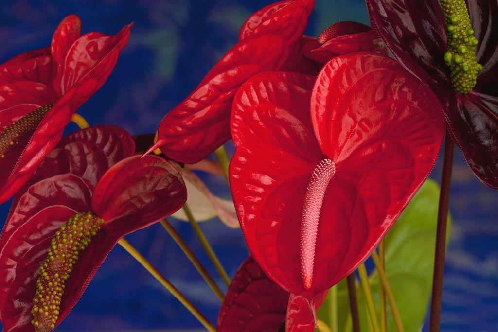Variety of cut red Anthurium flowers against blue background