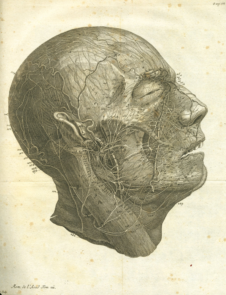 Diagram illustrating the veins on the right hand side of the face, head and neck. This image is accompanied by over 310 annotations. Plate 1 from Physiologische und anatomische Abhandlungen von einer ungewohnlichen Erweiterung des Herzens und denen Spannadern des Angesichts aus den Nachrichten der Akademie der Wissenschaften zu Berlin by Johann Friedrich Meckel (Berlin, Ambros. Haude und Johann Carl Spener, 1755). Inscribed: '[...] sculp. Mem: de l'Acad Tom vii'