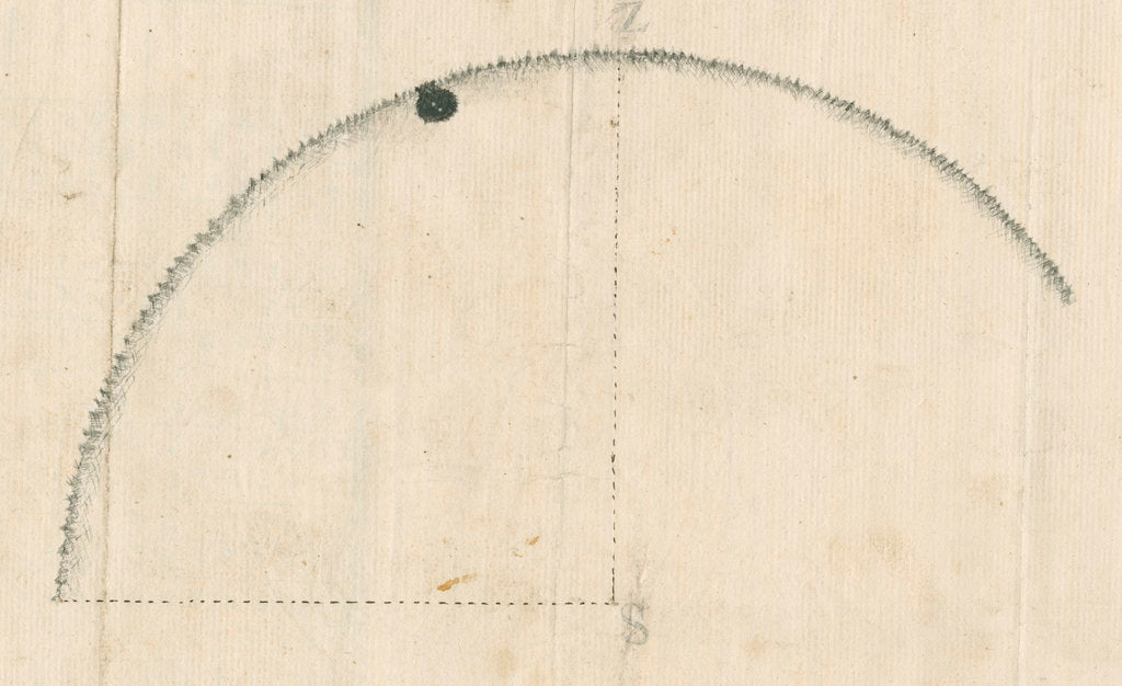 View taken at Mageroya, Nordkapp, Norway, during the 1769 Transit of Venus. Inscribed 'The appearance of Venus on the Sun at Magger & near the 1st internal contact - by Wiliam Bayley.' Published as plate 13 for the paper 'Astronomical observations, made at the North Cape, for the Royal Society', by William Bayly, Philosophical Transactions of the Royal Society, vol.59, 1769, pp.262-272. William Bayly was employed as an assistant by Nevil Maskelyne at the Royal Observatory, Greenwich and would later act as an astronomer to James Cook's second and third Resolution expeditions. He had charge of the Society's two Arnold chronometers aboard HMS Adventure on the second circumnavigation.