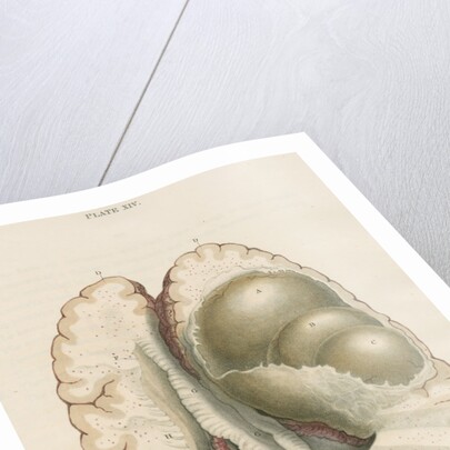 Section of both hemispheres of the human brain, showing three 'vesicles' in the right hemisphere. Plate 14 from the monograph The morbid anatomy of the human brain; being illustrations of the most frequent and important organic diseases to which that viscus is subject, by Robert Hooper (London, Longman, Rees..., 1826). Inscribed: 'PLATE XIV. J.Howship, delt. J.Stewart sculpt. VESICLES OF THE BRAIN. Published by Dr. Hooper. Jany.1826.