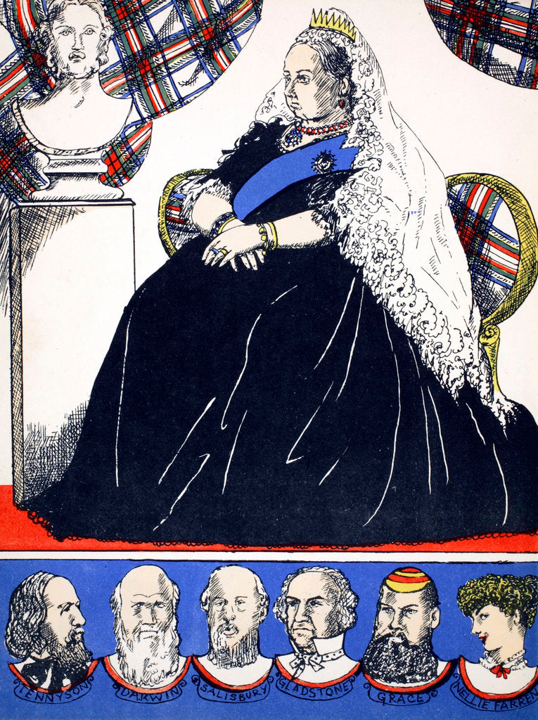 Victoria, Queen of Great Britain and Ireland from 1837, (1932). The busts represent prominent personalities from Victoria's (1819-1901) reign: Albert, Prince Consort (1819-1861); Alfred, Lord Tennyson (1809-1892), Poet Laureate; Charles Darwin (1809-1882), naturalist; Robert Gascoyne-Cecil, 3rd Marquess of Salisbury (1830-1903), Prime Minister; William Gladstone (1809-1898), Prime Minister; WG Grace (1848-1915), English cricketer; Nellie Farren (1848-1904), actress and singer. From Kings and Queens by Eleanor and Herbert Farjeon, 1932.