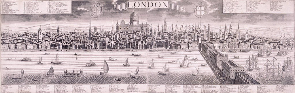 View of the City of London from across the River Thames, c1710; showing St Paul's Cathedral in the centre and London Bridge in the foreground. Also including ships, boats and barges, coats of arms and a title ribbon in the sky. Includes a key.