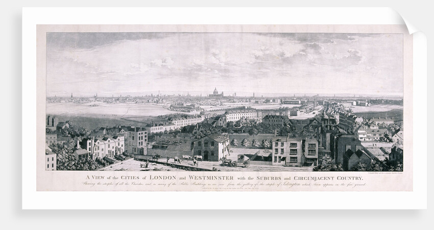 View of London from Islington, 1789. View of Westminster and the City of London from Islington, showing Church Street in the foreground, Upper Street and Lower Road, with New River and City Road beyond. St Paul's Cathedral can just be seen in the distance. Builders work on Islington Chapel; a horse drawn carriage and cattle can also be seen.