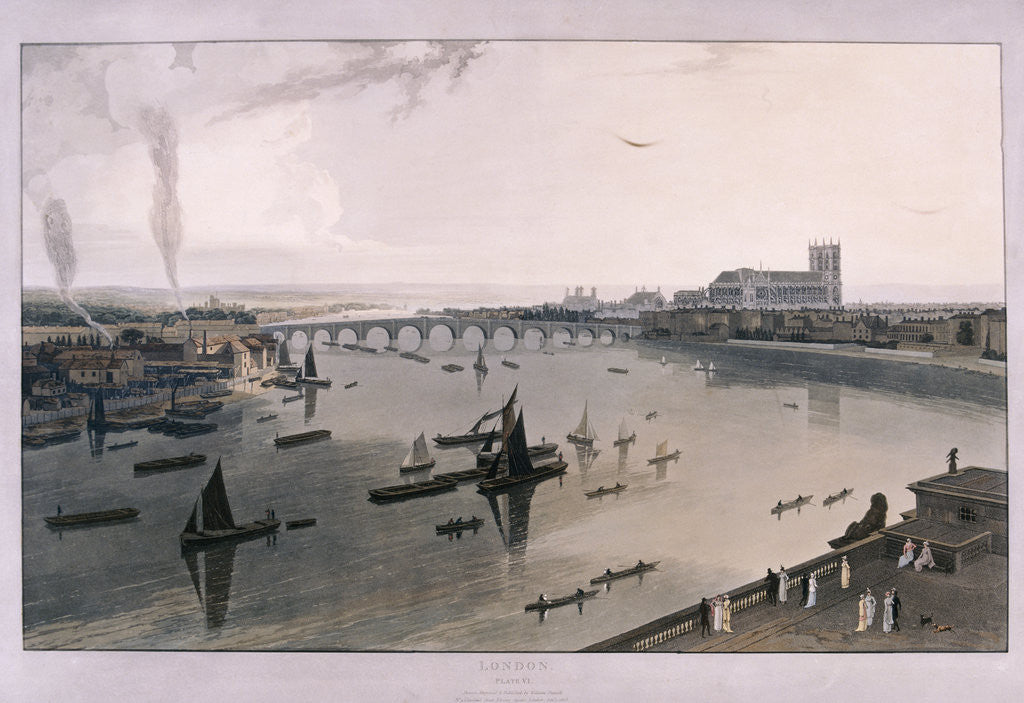 View of London from Somerset House, 1805. View south from the terrace of Somerset House, looking towards Lambeth, left, Westminster Bridge, and Westminster Abbey, right. Barges and other boats sail on the River Thames; people stroll on the terrace and admire the view.