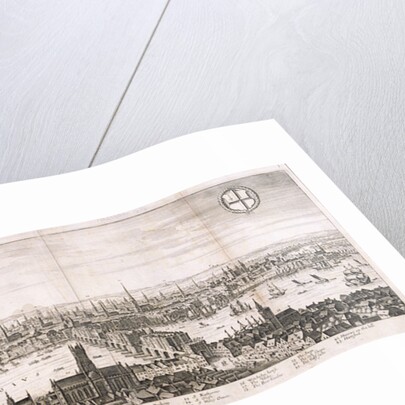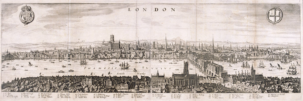 View of London from the south, 1638. Panoramic view of Westminster and the City of London looking across the River Thames from Southwark. The view extends on the north side of the river from Whitehall to St Katherine's by the Tower with a corresponding key. Above are the royal arms enclosed in a garter and surmounted by a crown, and the City's arms in a laurel wreath.