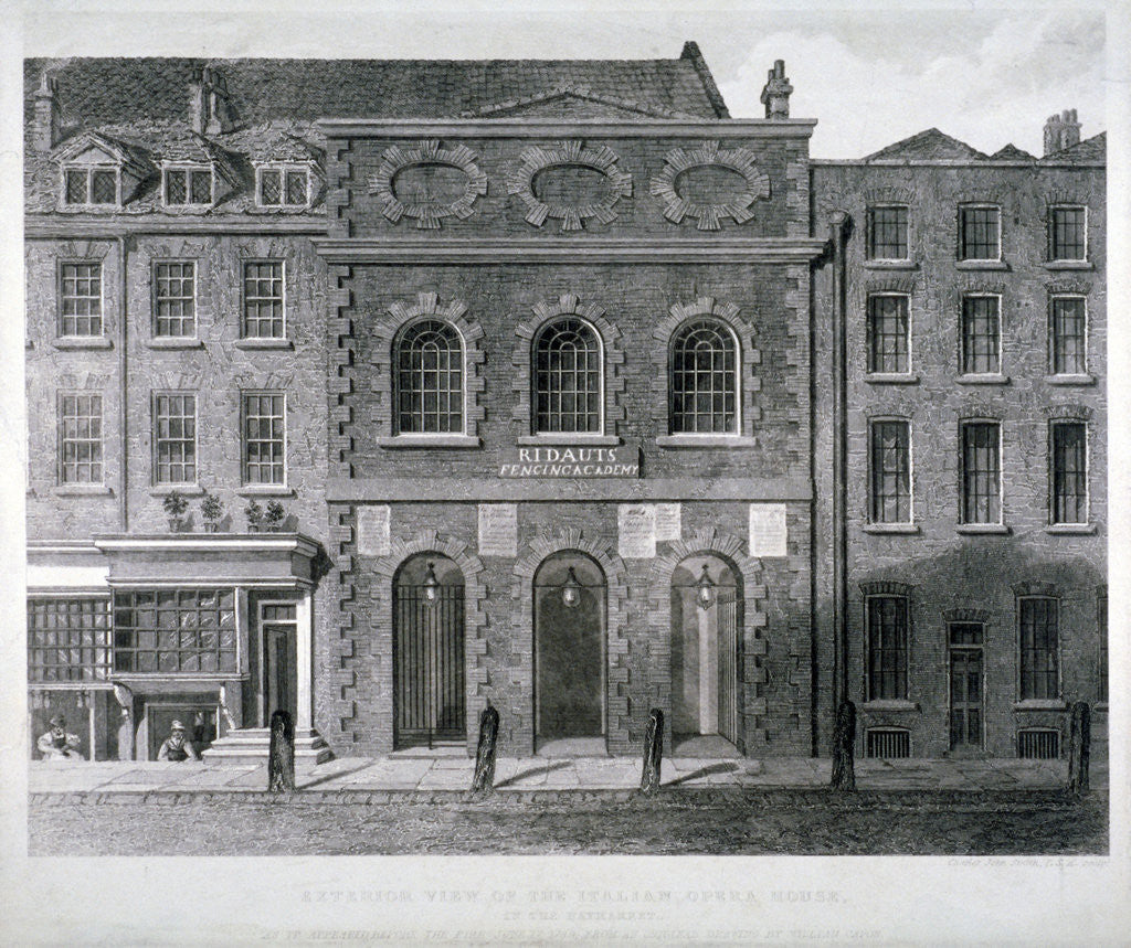 View of the King's Theatre, Haymarket, London, 1789. Also showing Ridaut's fencing academy.