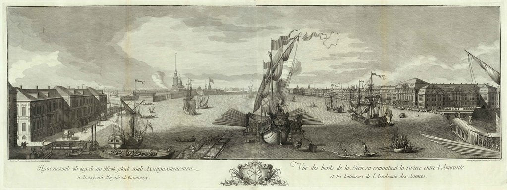 View of the Neva Downstream from the Admirality and the Academy of Sciences (Book to the 50th anniversary of St Petersburg), 1753. Found in the collection of the Russian National Library, St. Petersburg.