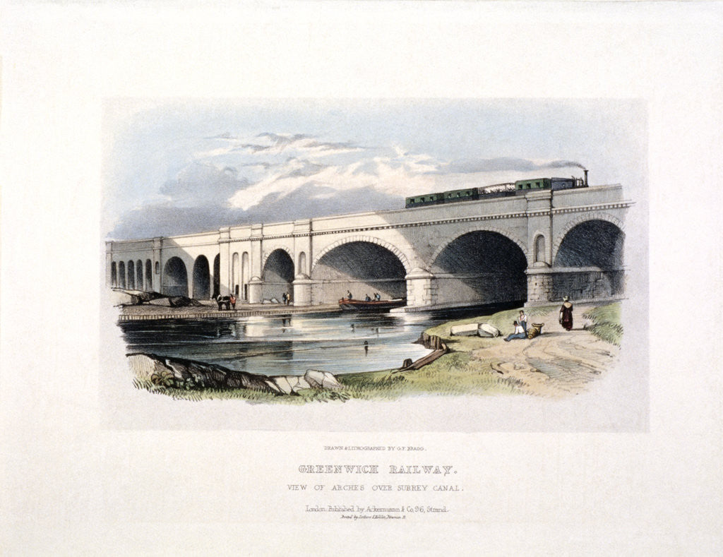 View of the Surrey Canal, Deptford, London, c1840. The Surrey Canal where it's crossed by Trundley's Road, with a steam train passing over the bridge.