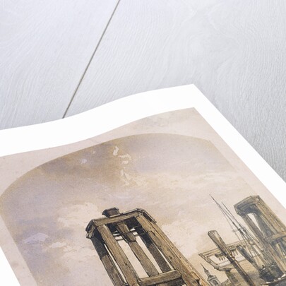 View of the Thames near Rotherhithe, Bermondsey, London, c1840. Two rowing boats move around a big wooden pier, which looms over the figures in the boats. In the background are moored ships and another pier.