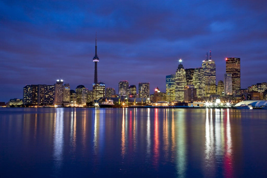 View of Toronto Skyline at Night from 'The Docks', Toronto, Ontario, Canada.