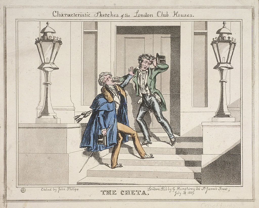 View of two drunken revellers on the steps of Crockford's Club, St James's Street, Westminster, London, 1829. One, in an overcoat, holds his hat and stick in his right hand while fending off with his left arm the other who, with his clothing disarranged, is pouring a drink down his throat from a cup.