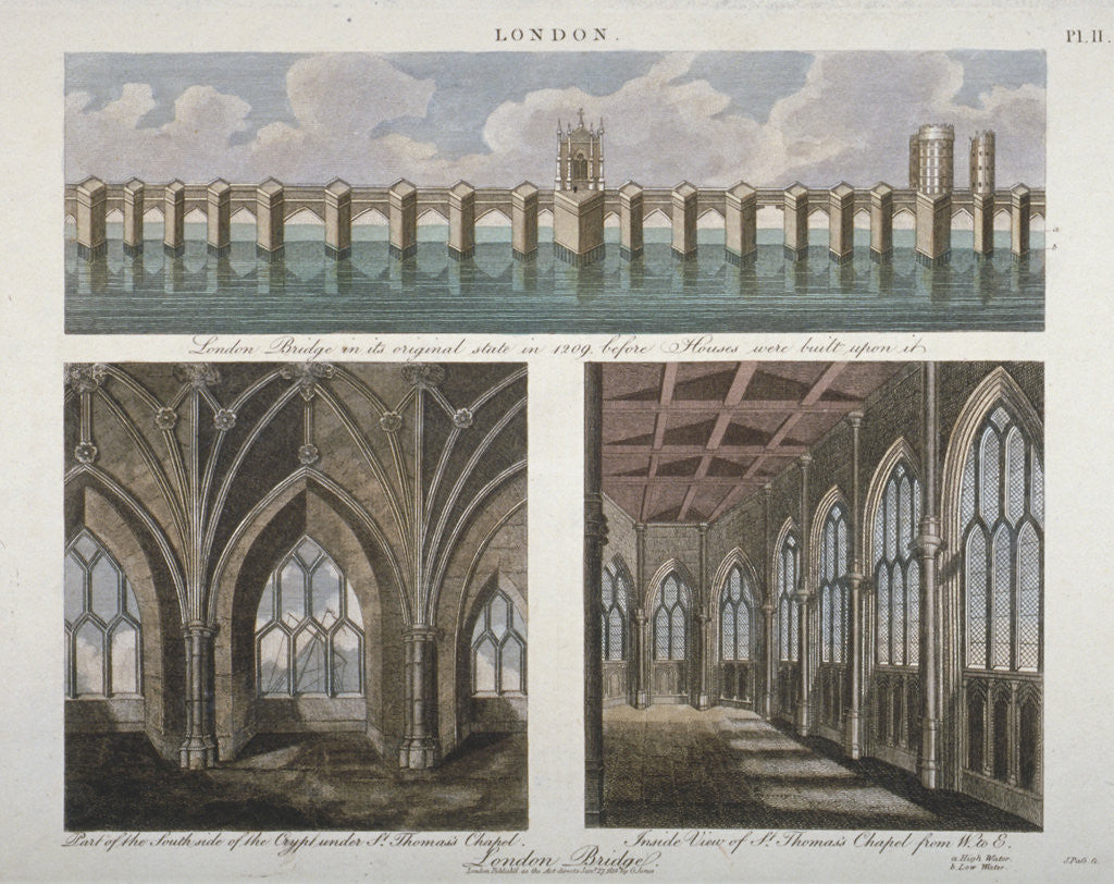 Views of the old London Bridge, 1814. The top section contains a view of London Bridge before houses were built on it. The bottom two sections are interior views of St Thomas Chapel, built on the central pier of London Bridge.