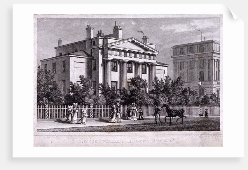 View of a doric villa at Regent's Park, London, 1827; with figures walking past.