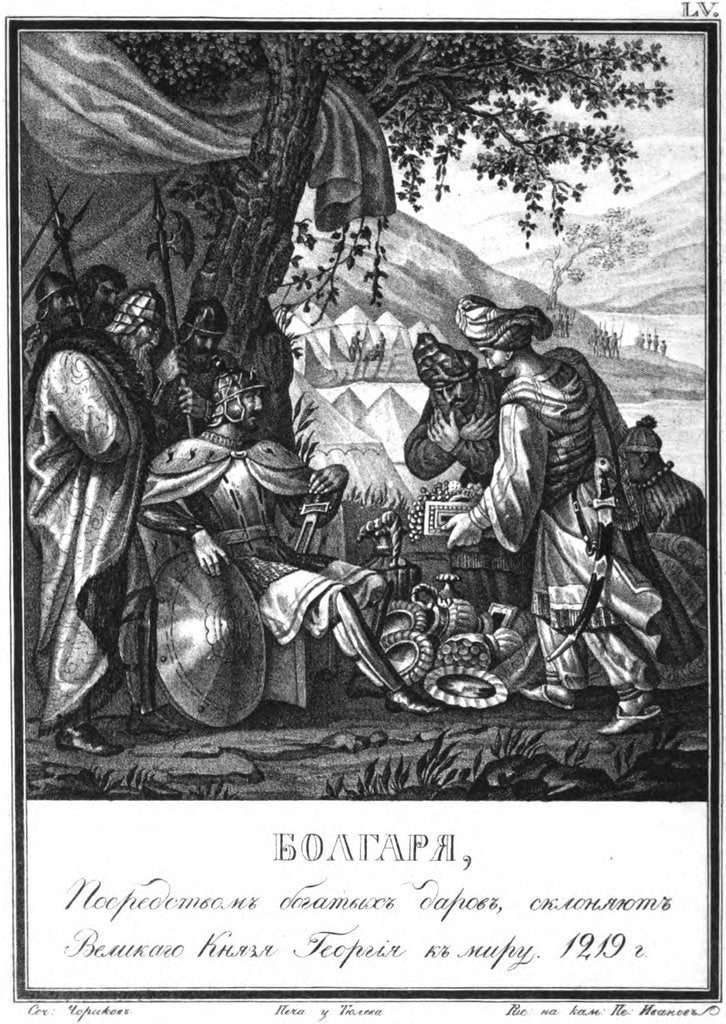 Volga Bulgarians tries to persuade George II to peace. 1219 (From Illustrated Karamzin), 1836. Found in the collection of Russian State Library, Moscow.