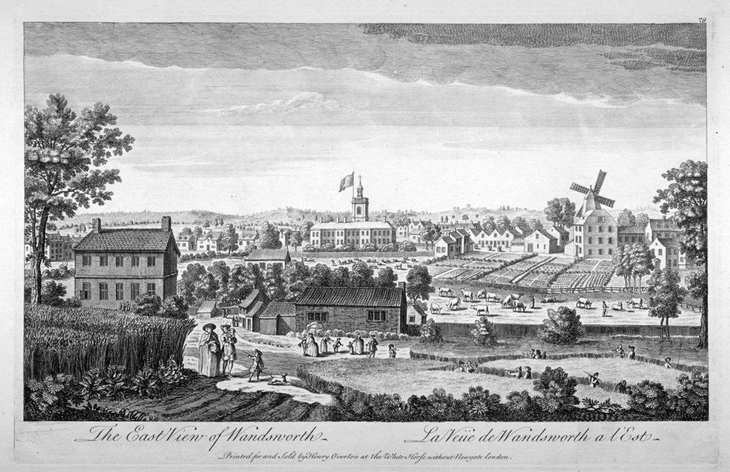 Wandsworth, London, c1750. East view of Wandsworth, including a windmill, figures and cattle.
