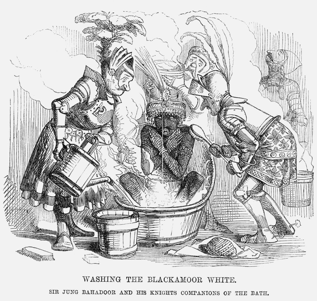 'Washing the Blackamoor white', 1858. 'Sir Jung Bahadoor and his Knights Companions of the Bath.' Sir Jung Bahadoor, a Nepalese prince, seems to have had a famous liaison with a prostitute of note named Laura Bell. Many believed that this later helped keep Nepal and its Ghurkha regiments faithful to the British during the Indian Mutiny which erupted in 1857. Her liaison with Prince Jung Bahadoor was the theme of numerous songs of the period. From Punch, or the London Charivari, July 17, 1858. Two knights clad in medieval armour, keep a bath topped up with hot water and scrub down the gentlemen sitting in the tub. This cartoon relates to what Punch described as an 'Ineffectual Ablution'. The Maharajah Jung Bahadoor had recently been created a Knight of the Bath. However, Mr Punch went on to point out, 'Jung Bahadoor is a gentleman of a dark red complexion. The Bath will not render it white'.