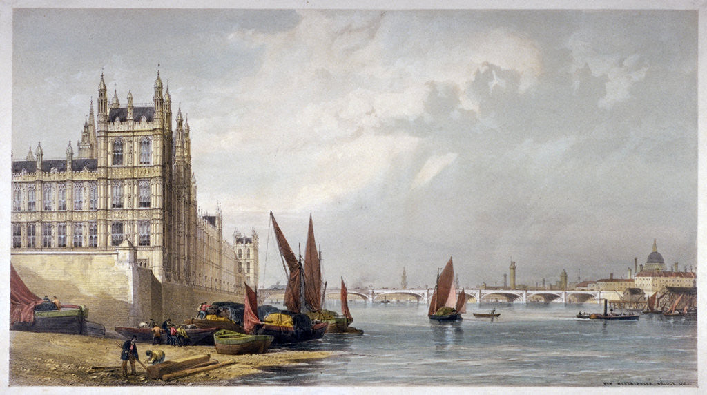 View of the new Westminster Bridge looking down river with the Palace of Westminster on the left and boats moored on the bank as well as on the River Thames.