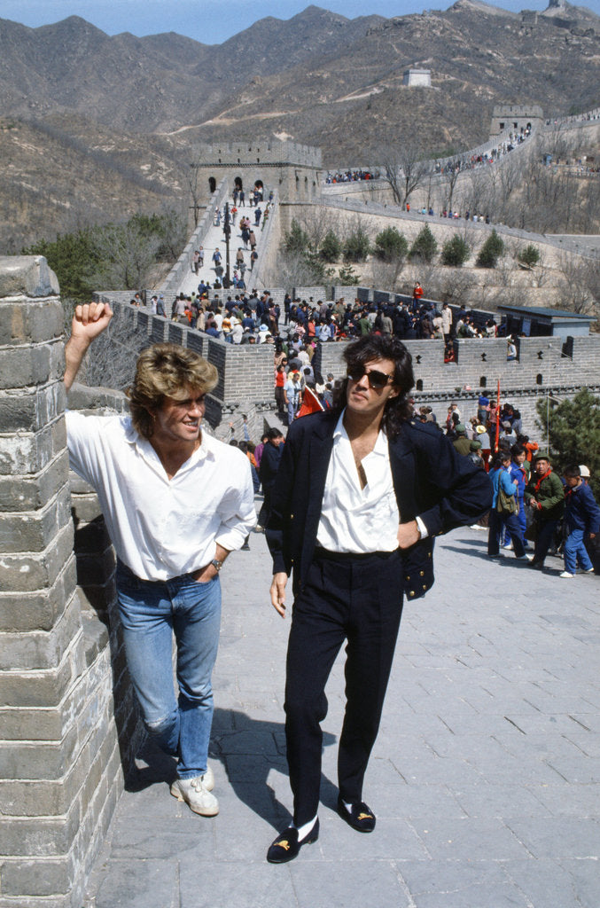 British pop group Wham pictured on their 10-day visit to China, April 1985. George Michael and Andrew Ridgeley pictured at the Great Wall of China.