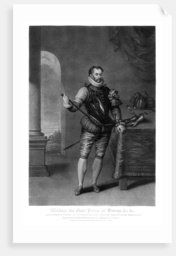 William I, Prince of Orange, (1816). Known as William the Silent (1533-1584), he was the leader of the Dutch revolt against the Spanish that sparked the Eighty Years War and led to the independence of the United Provinces in 1648. In 1580 William was declared an outlaw with a price on his head by Philip II of Spain and was assassinated by Balthasar Gerard, a French Catholic, four years later. A print from Fifteen Splendid Portraits of Royal Personages, engraved in mezzotinto by Richard Earlom, Charles Turner and R Dunkarton, printed by J McCreery, Black Horse Court, Fleet Street, London, 1816.