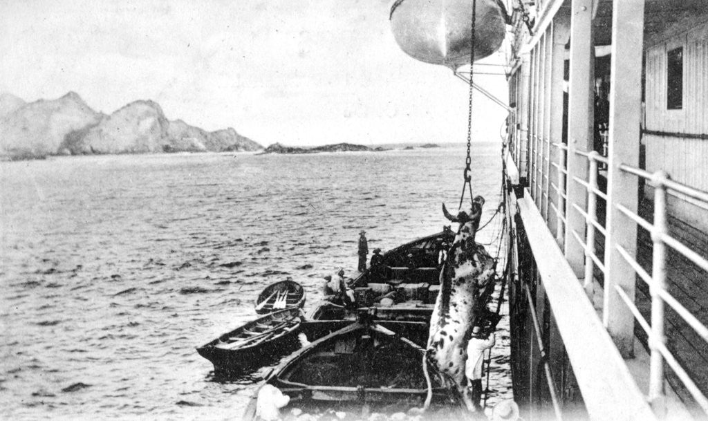 Winching a cow onto a boat off the coast of Chile, c1900s. Published by J. Alian (Valparaiso).