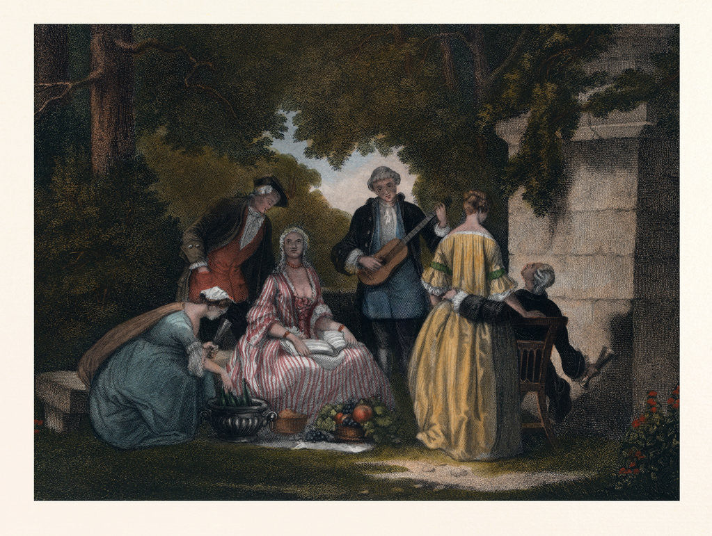Wine, Music, Party, in the Garden, Wine Bottles, Grapes, Fruit Basket, Music Instrument, 19th Century, Liszt Gourmet Archive