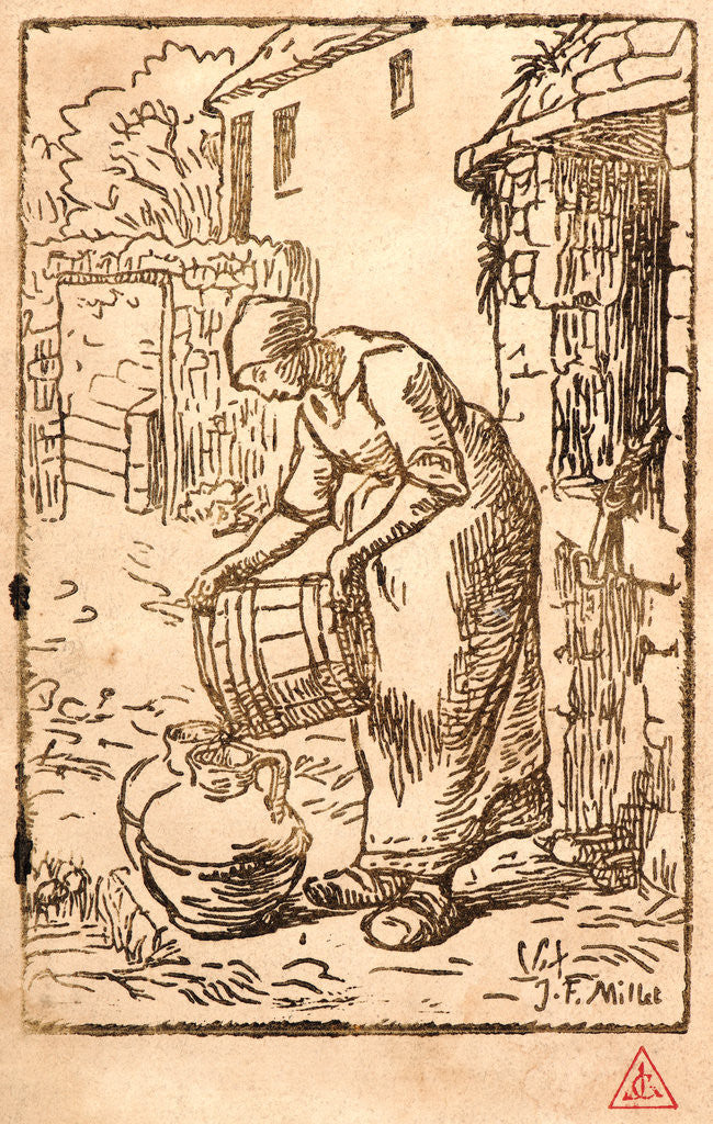 Jean-François Millet (French, 1814 - 1875). Woman Filling Water Cans (Femme vidant un seau), 1874. Woodcut printed in brown on heavy wove paper.