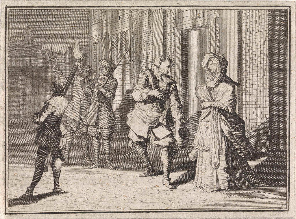 Woman finds her lover in the street at night, Caspar Luyken, Christoph Weigel, Frantz Martin Hertzen, 1710