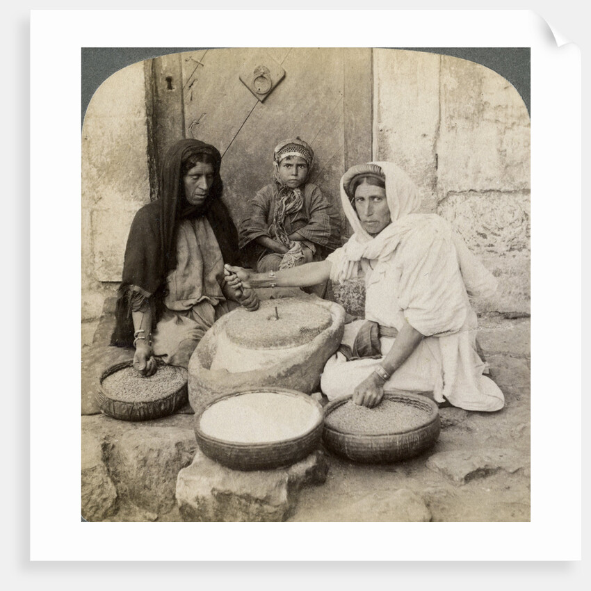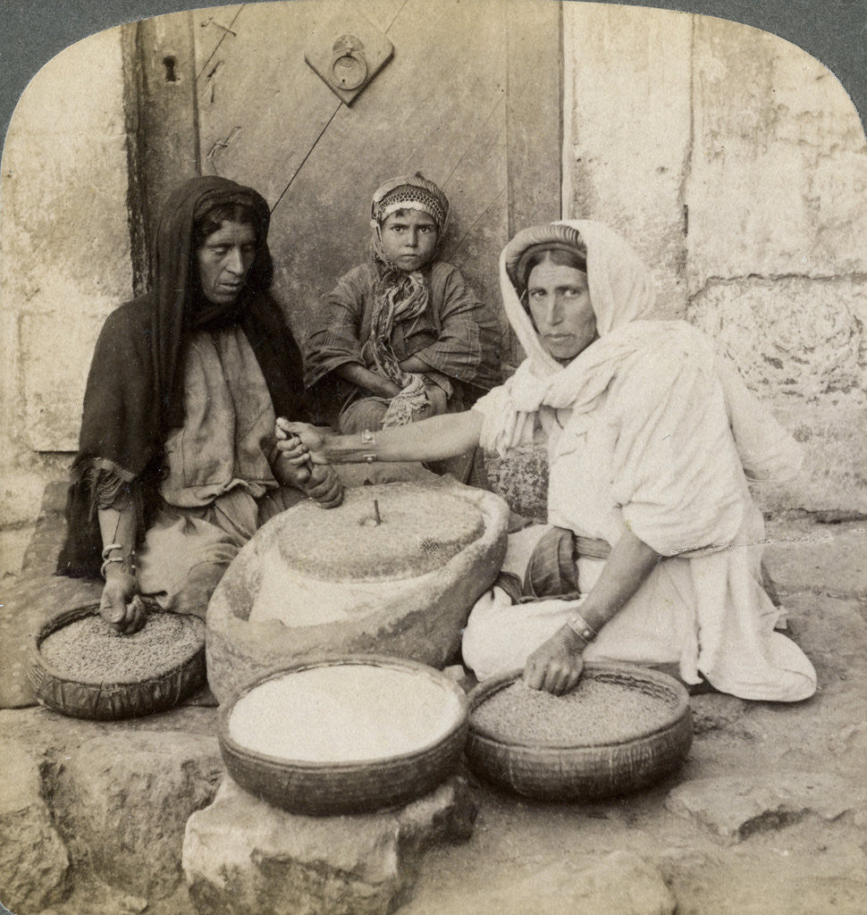 Women grinding at the mill, Palestine, 1900. Stereoscopic slide (detail). From a series called Travelling in the Holy Land Through the Stereoscope, by Jesse Hurlbut.