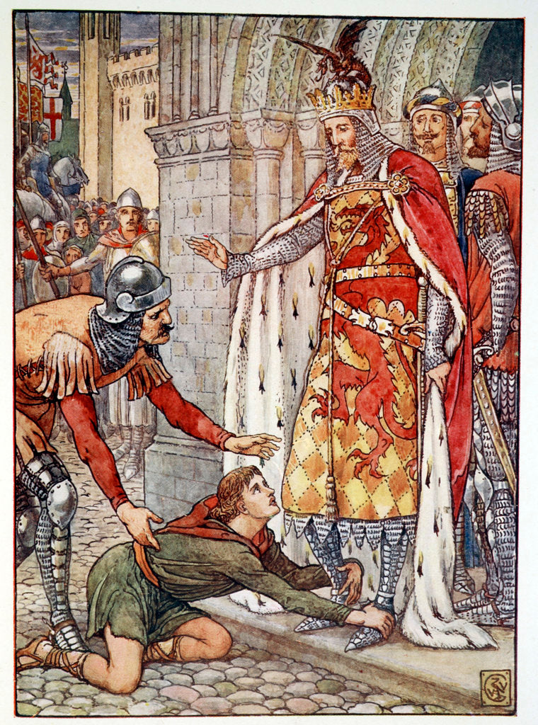 'Young Owen Appeals to the King', 1911. How Arthur was made king and won his kingdom. From Stories of the Knights of the Round Table by Henry Gilbert, first edition, 1911.