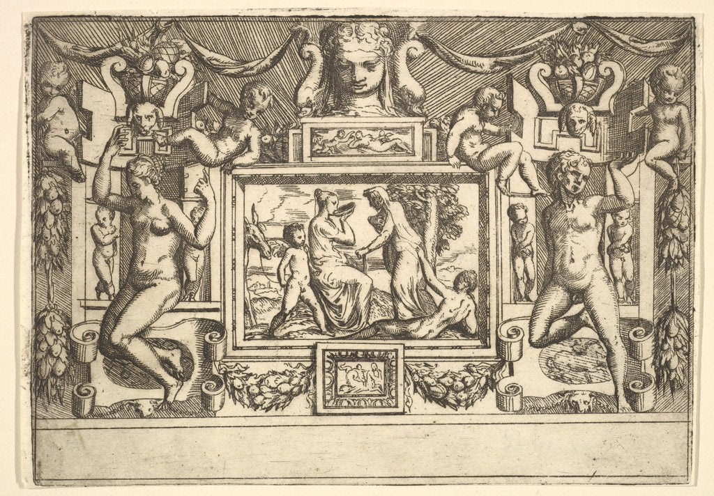 Young woman drinking from a bowl, an old woman standing in front of her, set within an elaborate frame, ca. 1540-80. Formerly attributed to Andrea Schiavone. After Jacques Androuet Du Cerceau